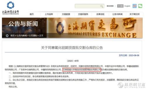 上海期货交易所氧化铝期货首批交割仓库在甘肃国通所在的兰州新区设立,有利于充分发挥物流枢纽、对外贸易和工业基础等优势,进一步提升有色金属交易平台的影响力和定价权,极大吸引西北氧化铝产业上下游资源向新区集聚,推动集仓储、物流、贸易、加工等为一体的有色金属全产业链发展。甘肃国通将以此为契机,按照核定库容加快开展氧化铝期货交割仓库业务准备工作,确保于2023年9月20日起,接受氧化铝期货标准仓单生成业务,稳健服务铝产业集群高质量发展。